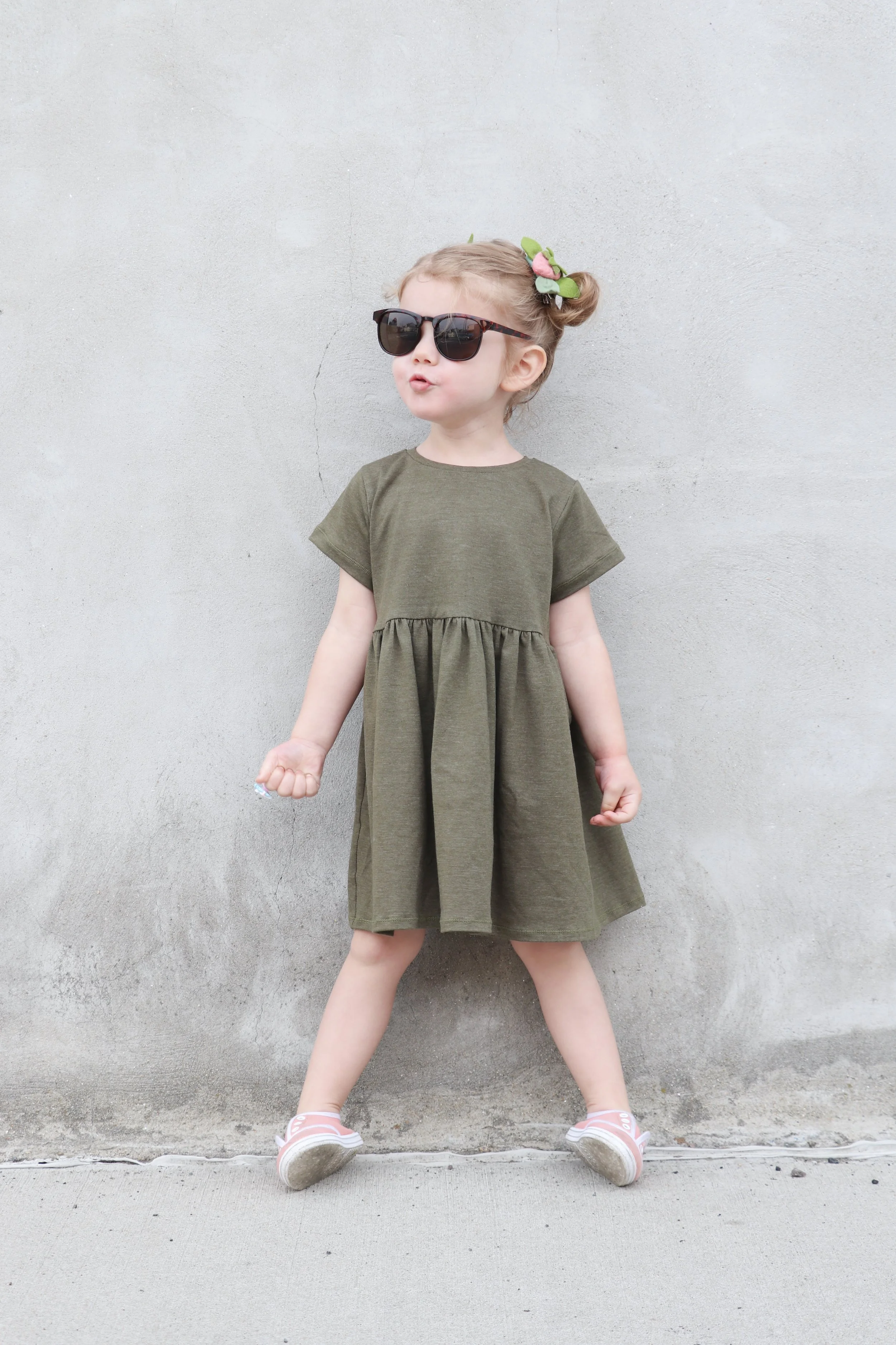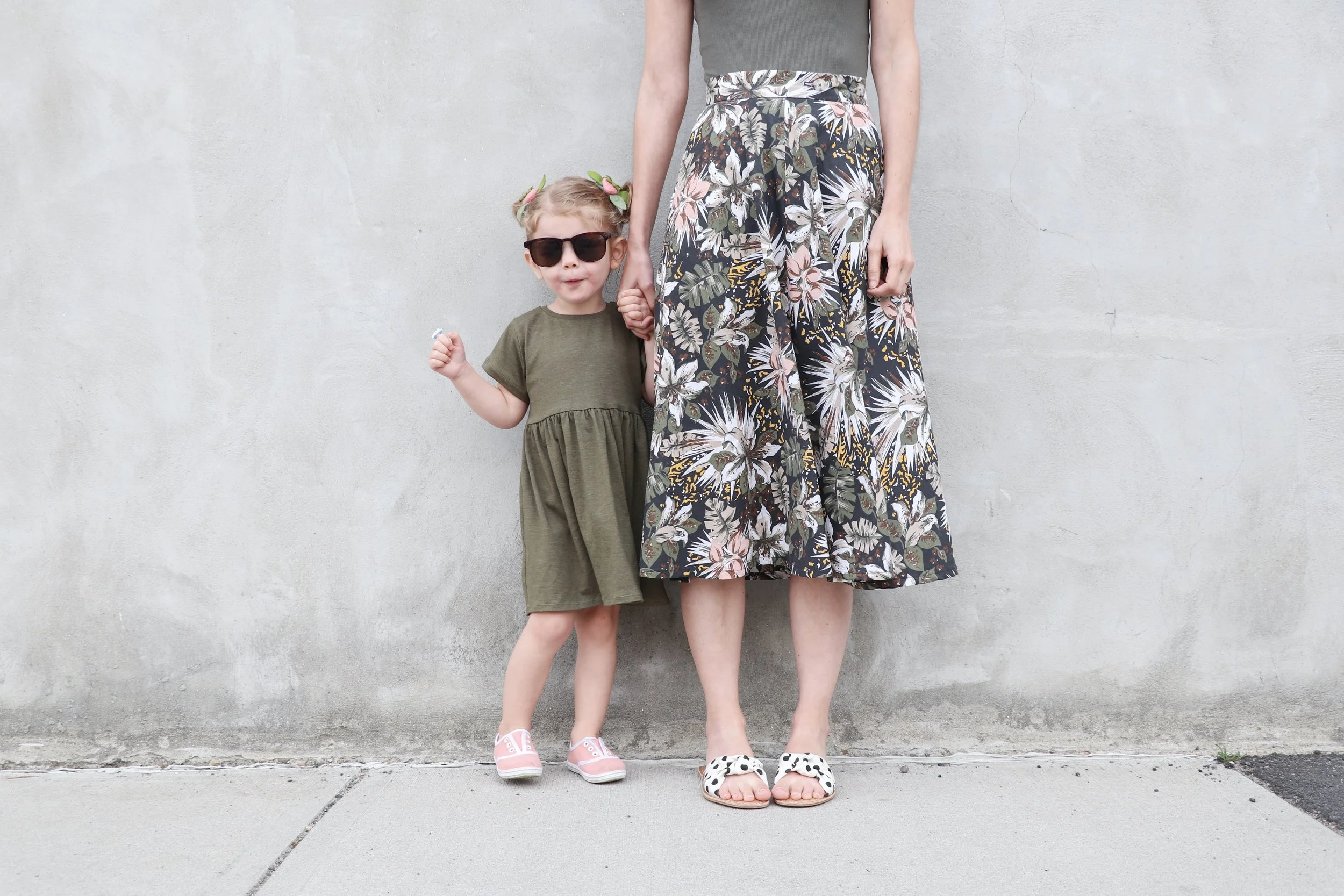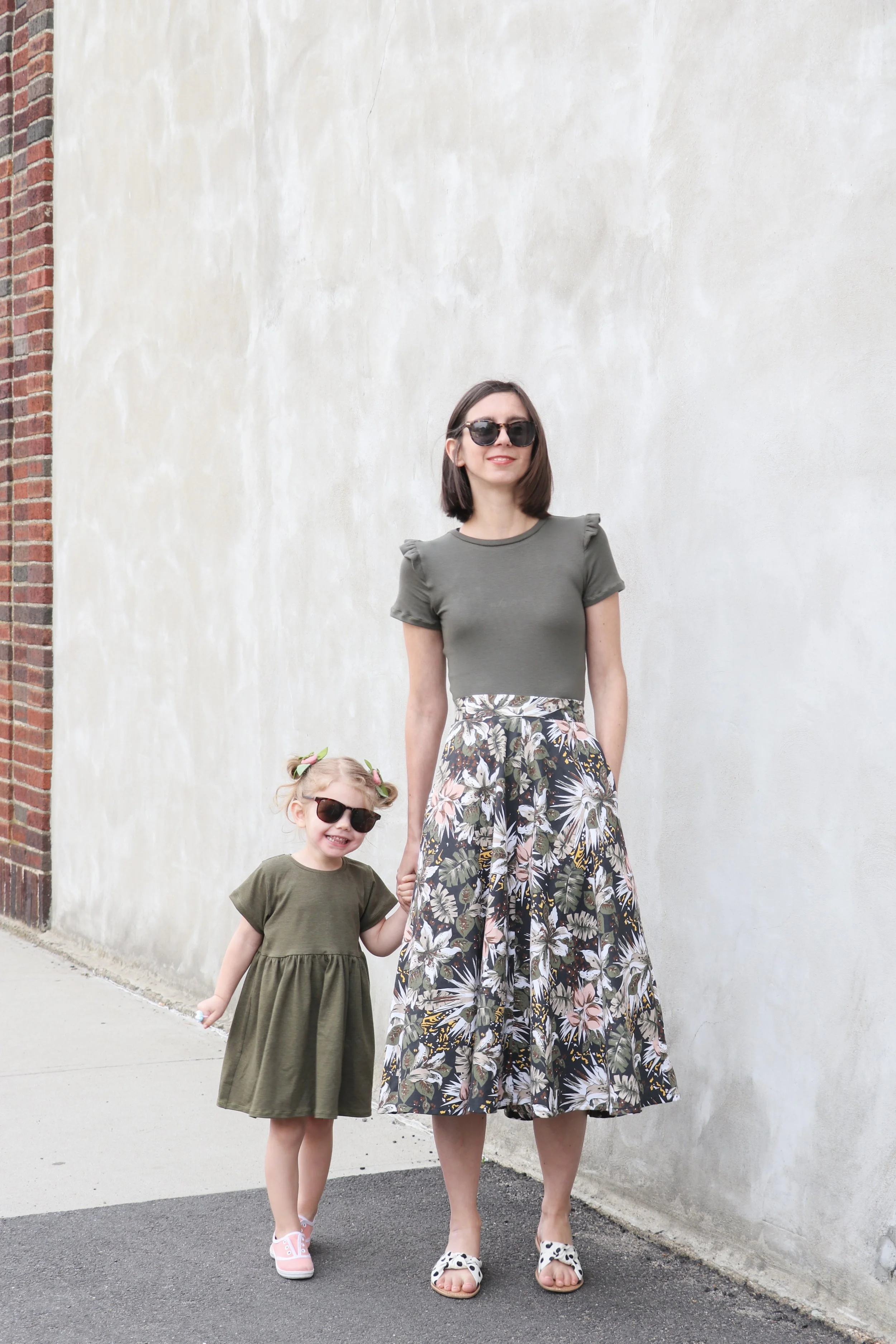 This Rowan bodysuit is my favorite one yet. I added in shoulder ruffles again like I have before (This time I documented the process, so there will be a tutorial on Design Diary sometime soon!). And the green pairs perfectly with this floral Wattle skirt. I didn’t have enough of the ribbed fabric left to make anything for P, so I grabbed this other green knit form Nelly Lou stash and whipped up our go-to gathered dress. Not a perfect match, but she still thought we were in matching outfits, so it was a win! She actually loves matching me, and I hope it never ends. I mean, I know it will, but I seriously live for this.