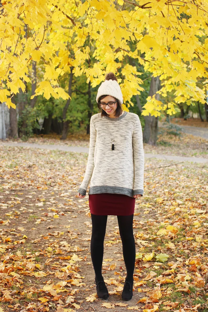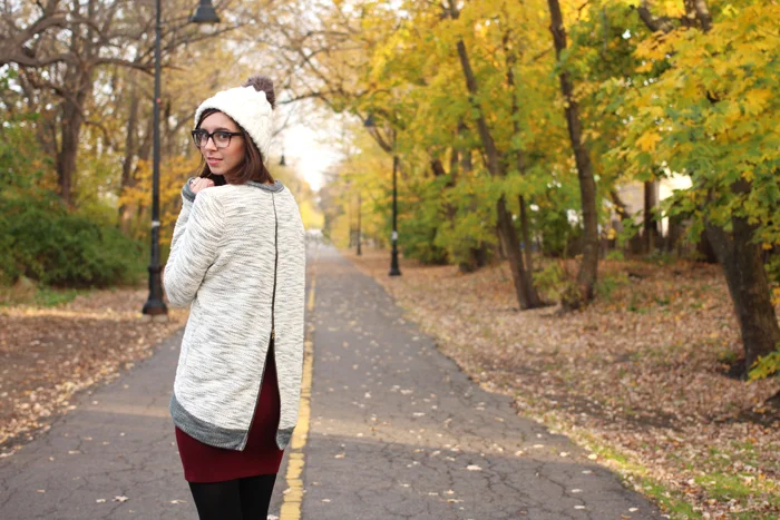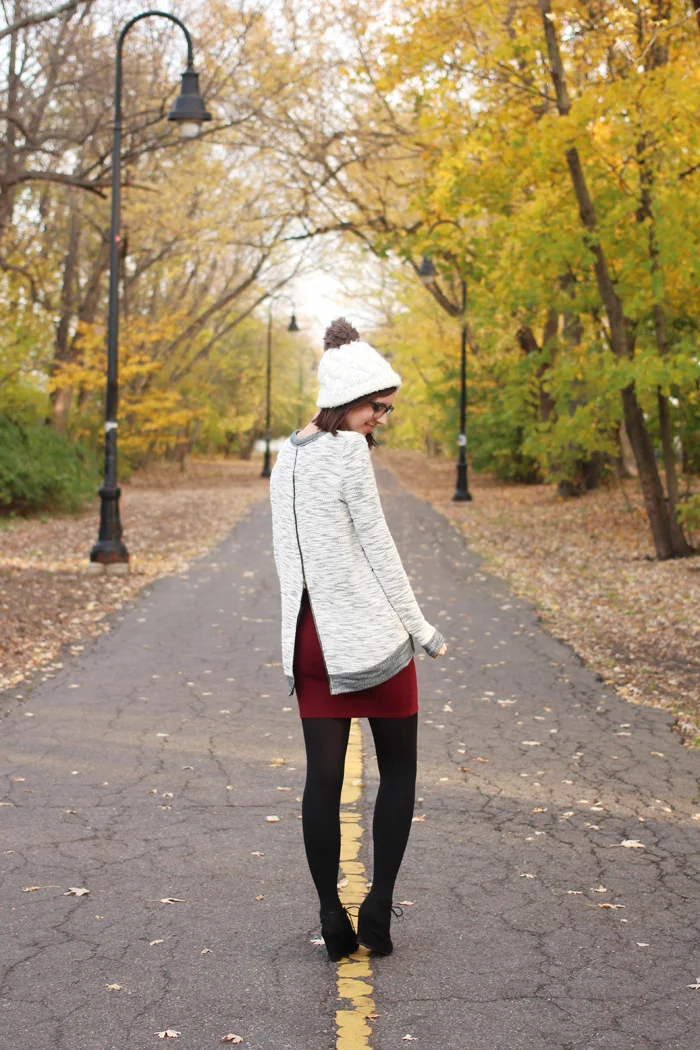 1. knit midi dress from Topshop --- 2. boucle cardigan from Topshop --- 3. pom pom beanie from ASOS --- 4. gold mini card holder by shopHollyDolly --- 5. candy rubber satchel in berry by Furla from Shopbop --- 6. azeban heels by Kate Spade --- 7. spool necklace by shopHollyDolly